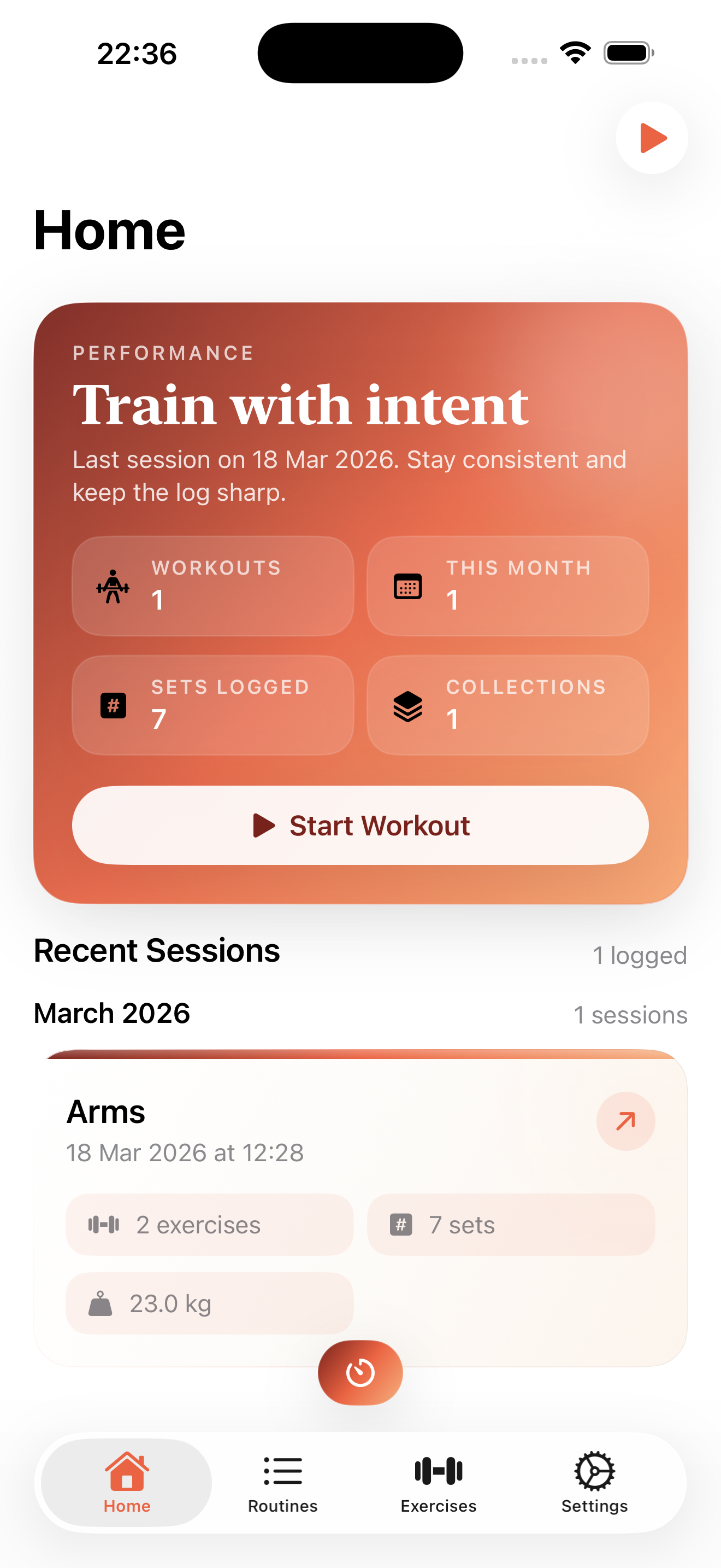 A native iOS workout tracking app with SwiftData persistence, custom analytics, and a clean design system built for serious athletes.